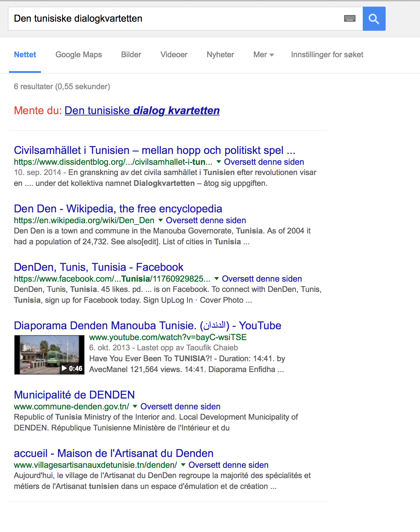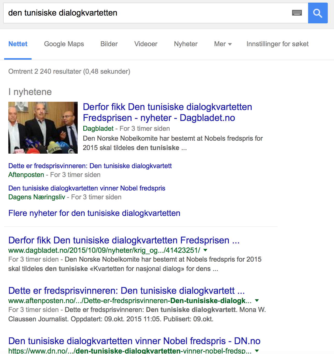 Today, the Tunisian National Dialogue Quartet won the Nobel Peace Prize. I have no real qualms about this nomination, but I find the effect it had on Google search results interesting.